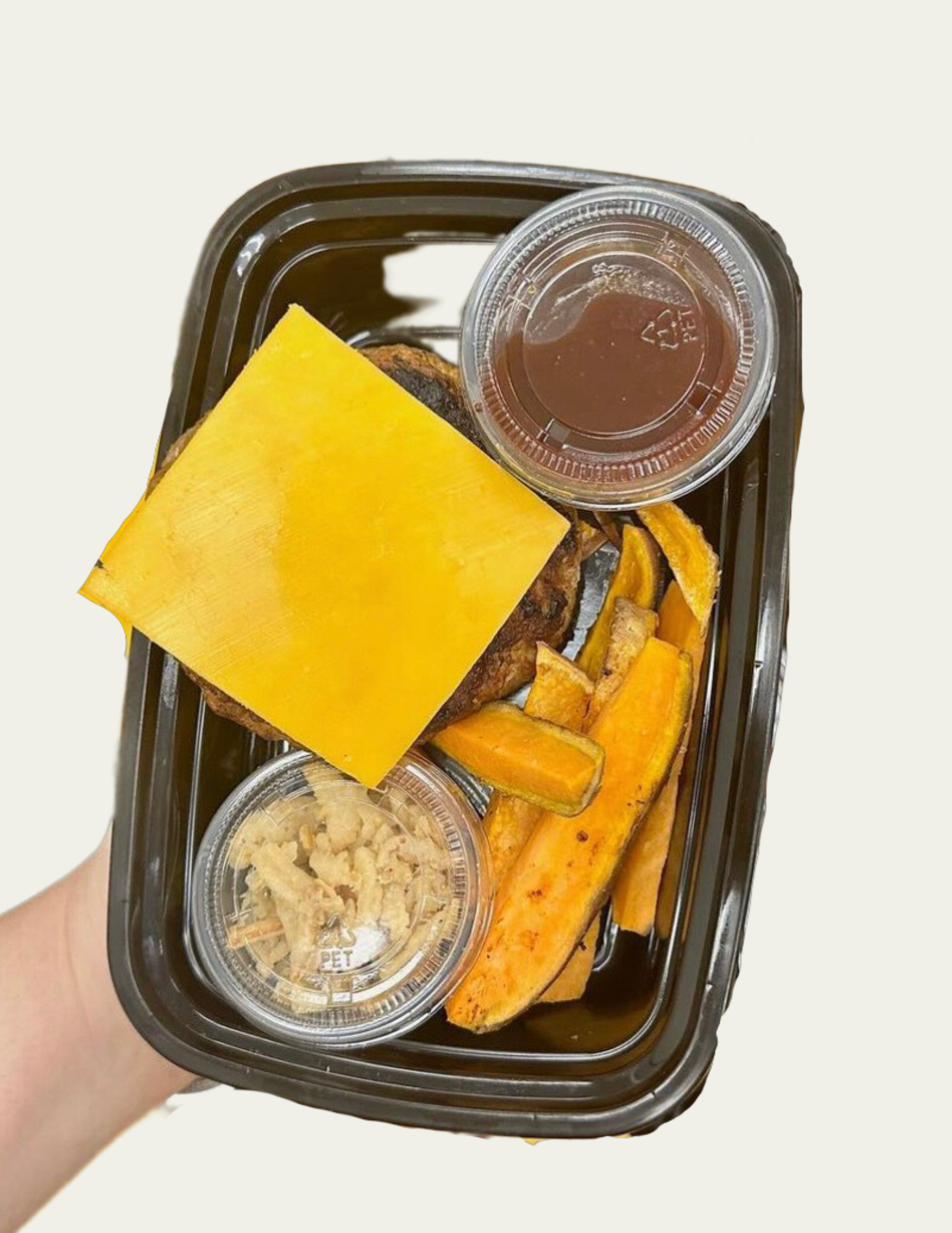 turkey, sweet potato, cheddar cheese, BBQ sauce, crispy onions, garlic, onion, sea salt