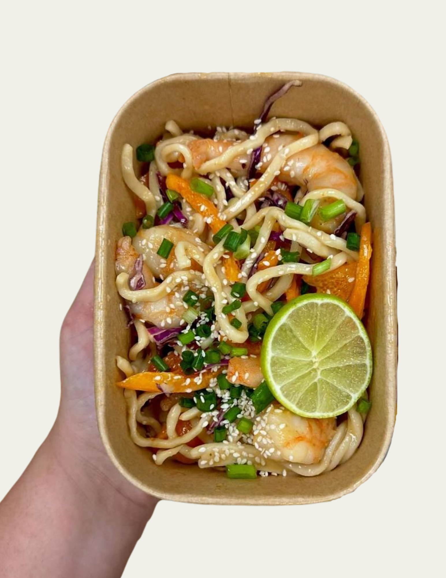 shrimp, whole wheat noodles, red cabbage, red bell pepper, peanut butter, soy sauce, garlic, green onion, honey, sesame seeds